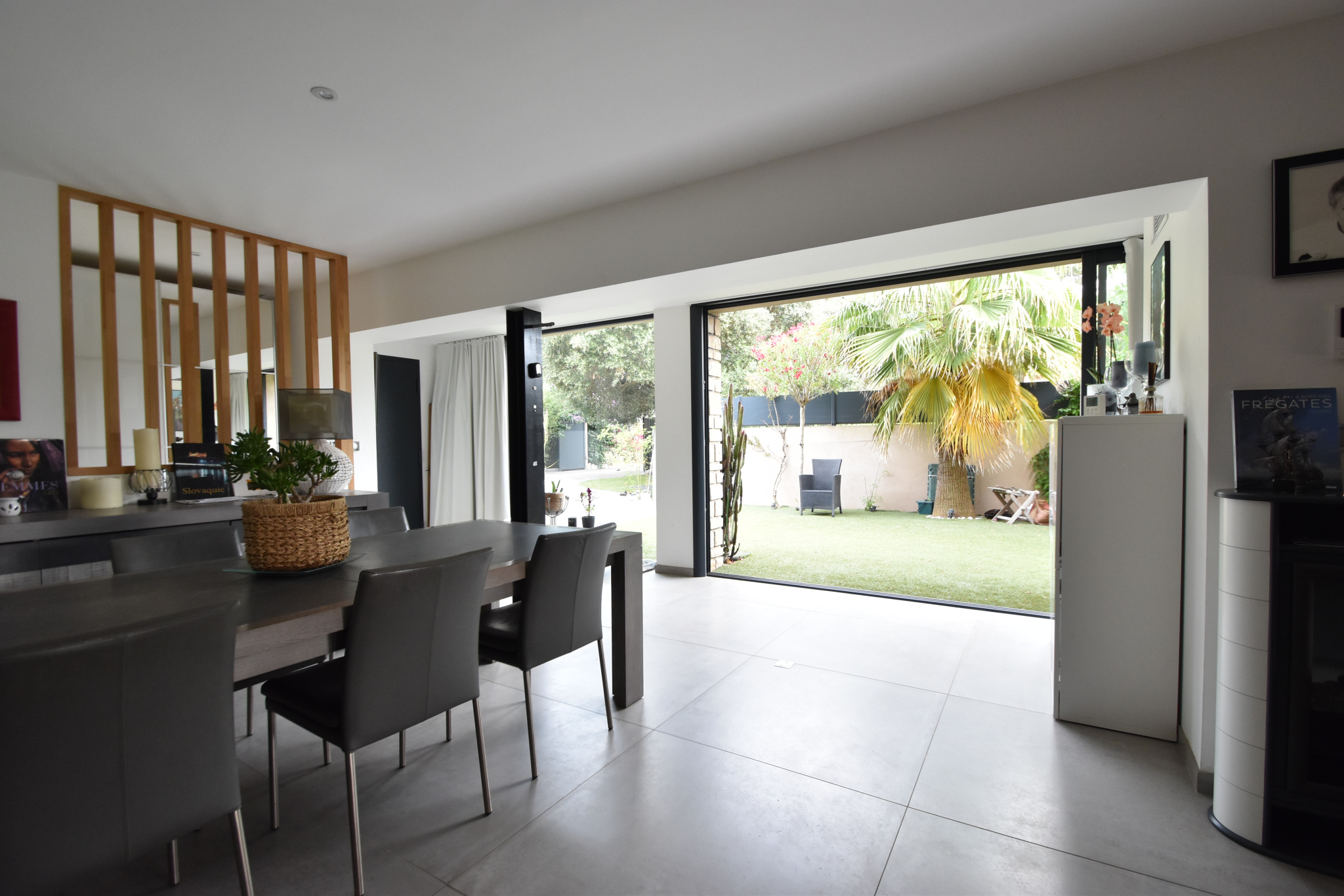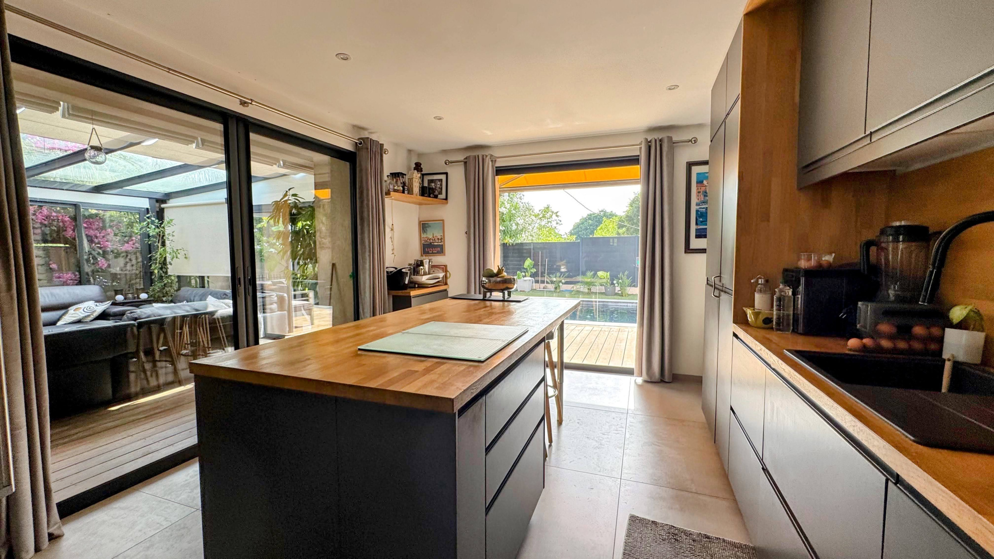 oVéranda baignée de lumière donnant sur deux ambiances extérieures