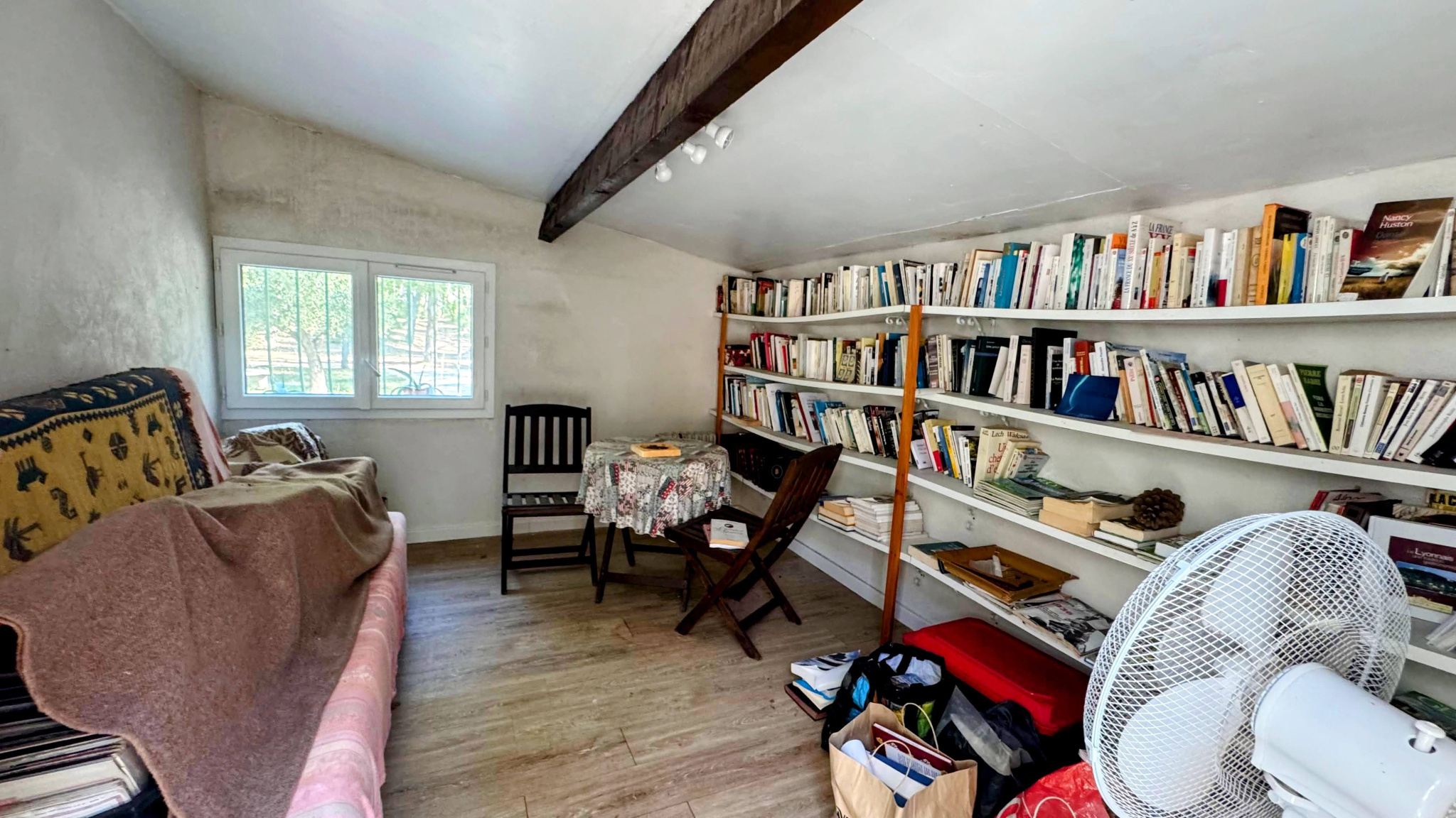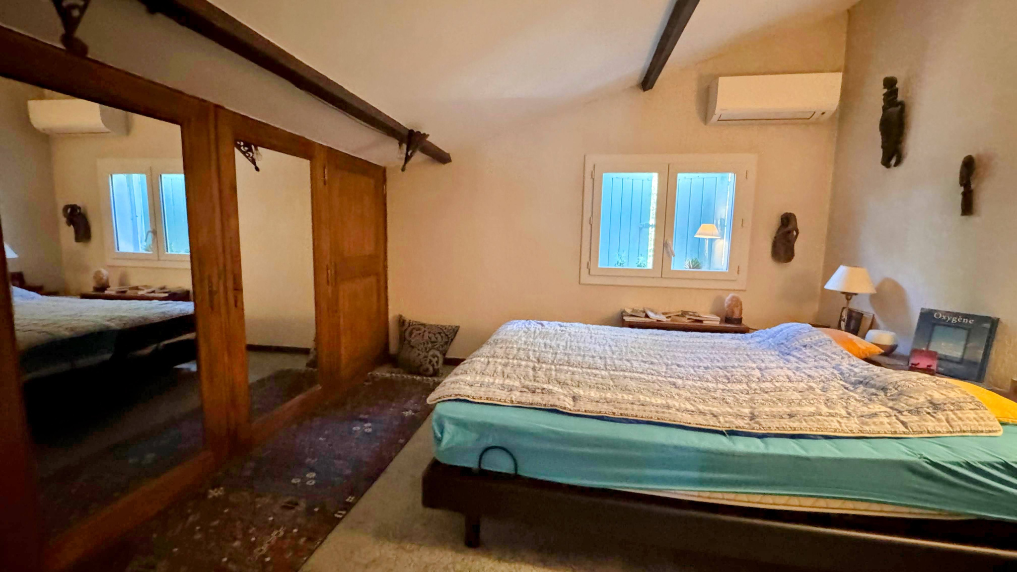 oÀ l’étage, une bureau et une chambre mansardés avec de nombreux rangements.