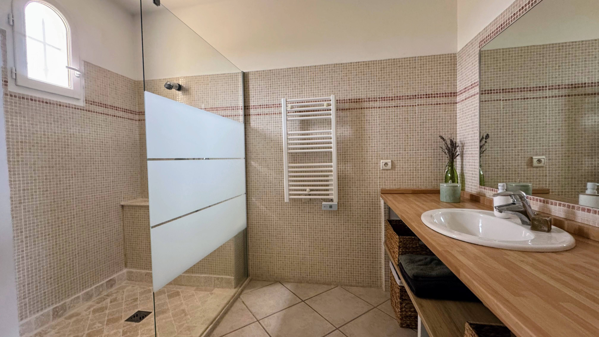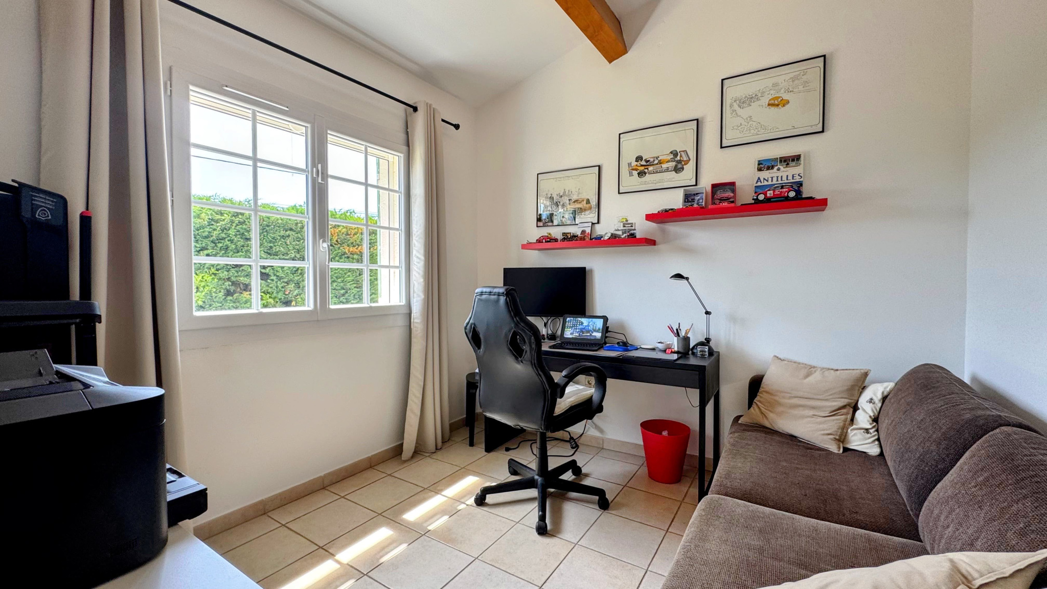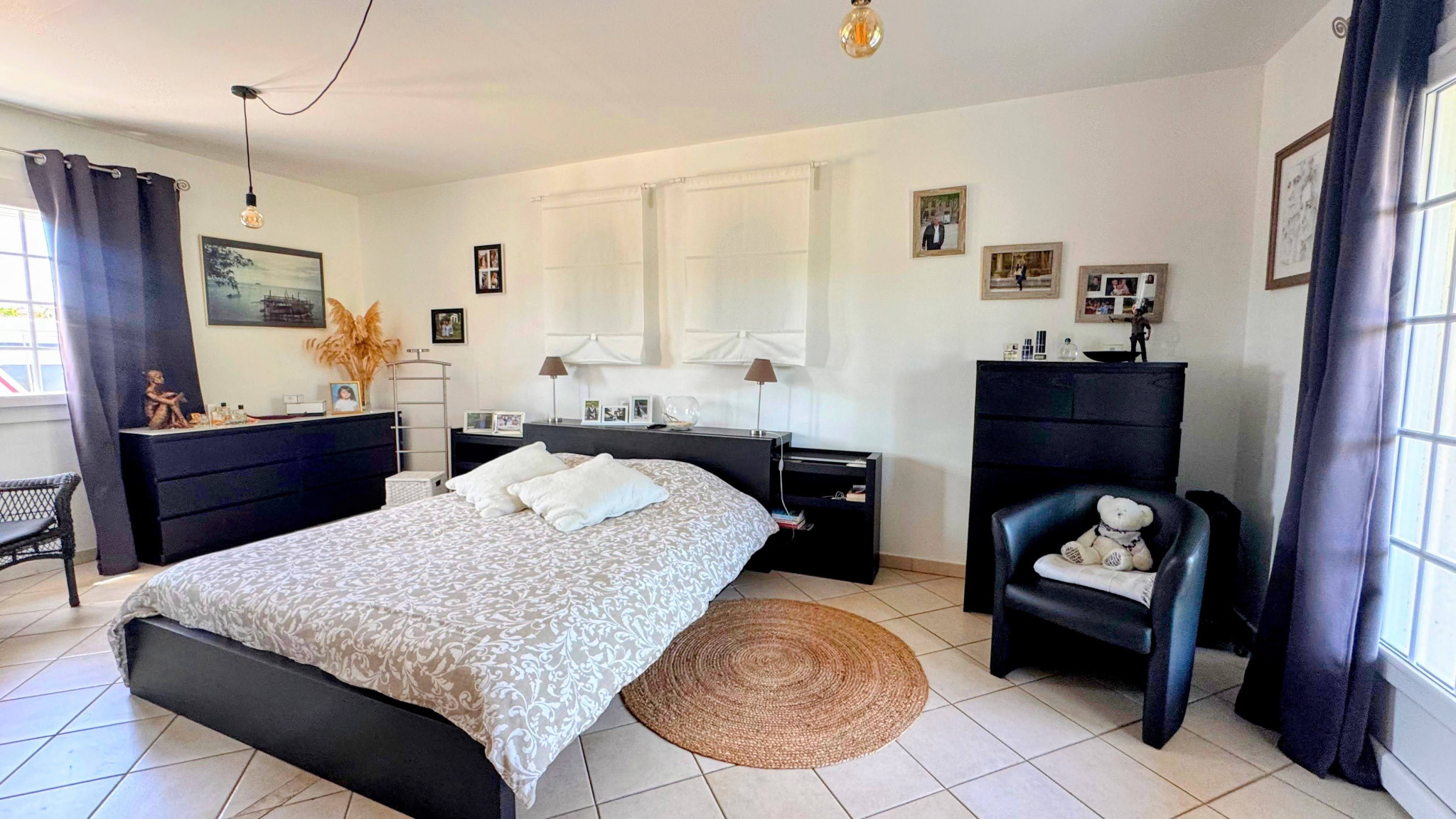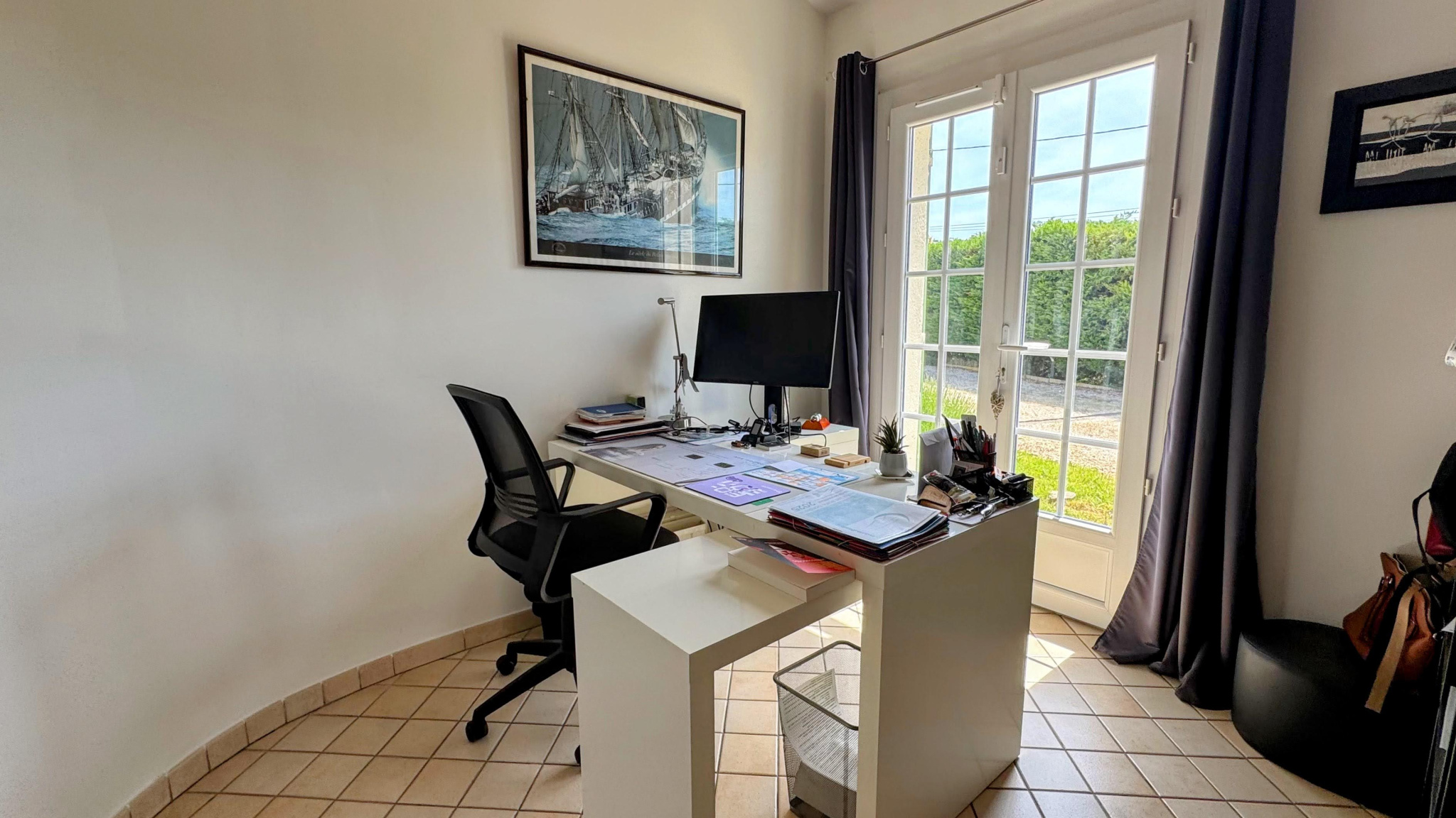 Son vaste hall d’entrée dessert l’espace à vivre et également ses trois chambres en rez-de-chaussée dont une très spacieuses, un bureau, une salle de bains, et un WC séparés. À l’étage, une suite parentale avec salle d’eau, WC et un grand dressing offre un espace nuit confortable et intimiste.