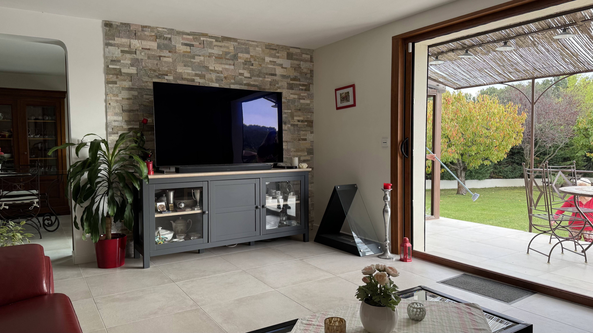 L’entrée avec placard dessert un vaste séjour de 45 m2, composé d’un salon, d’une cuisine semi-ouverte aménagée et d’un coin repas donnant accès à une véranda chauffée de 15 m2, idéale pour profiter d’un espace supplémentaire toute l’année.